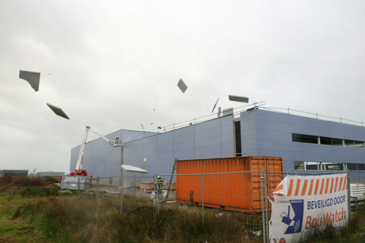 HEERENVEEN – Op Mars bij Heerenveen vliegen door de harde wind dakplaten en andere bouwmaterialen in het rond.