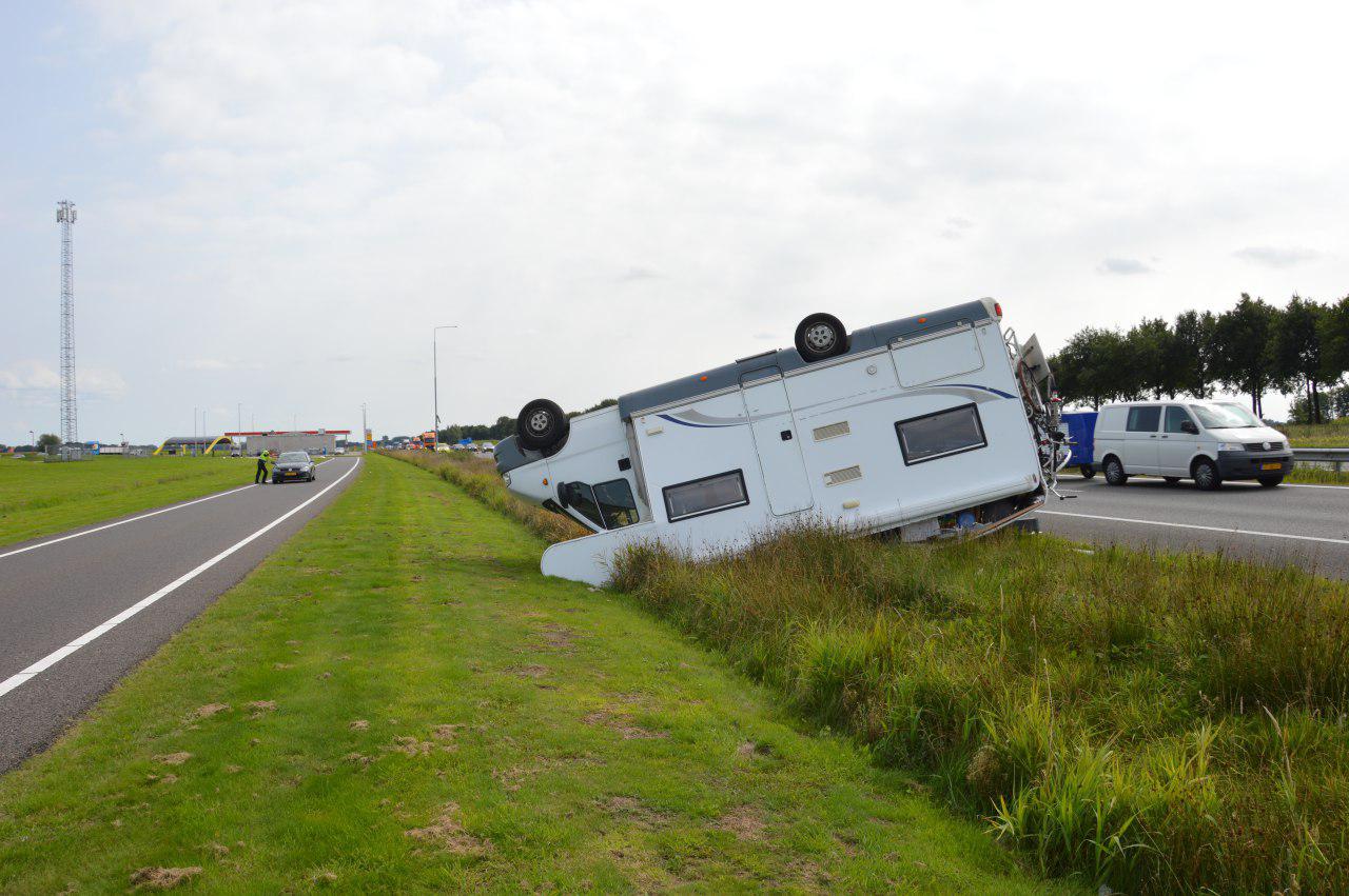 Oldeholtwolde – Een camper is dinsdagmiddag door onbekende oorzaak op haar dak langs de A32 bij Oldeholtwolde terecht gekomen.