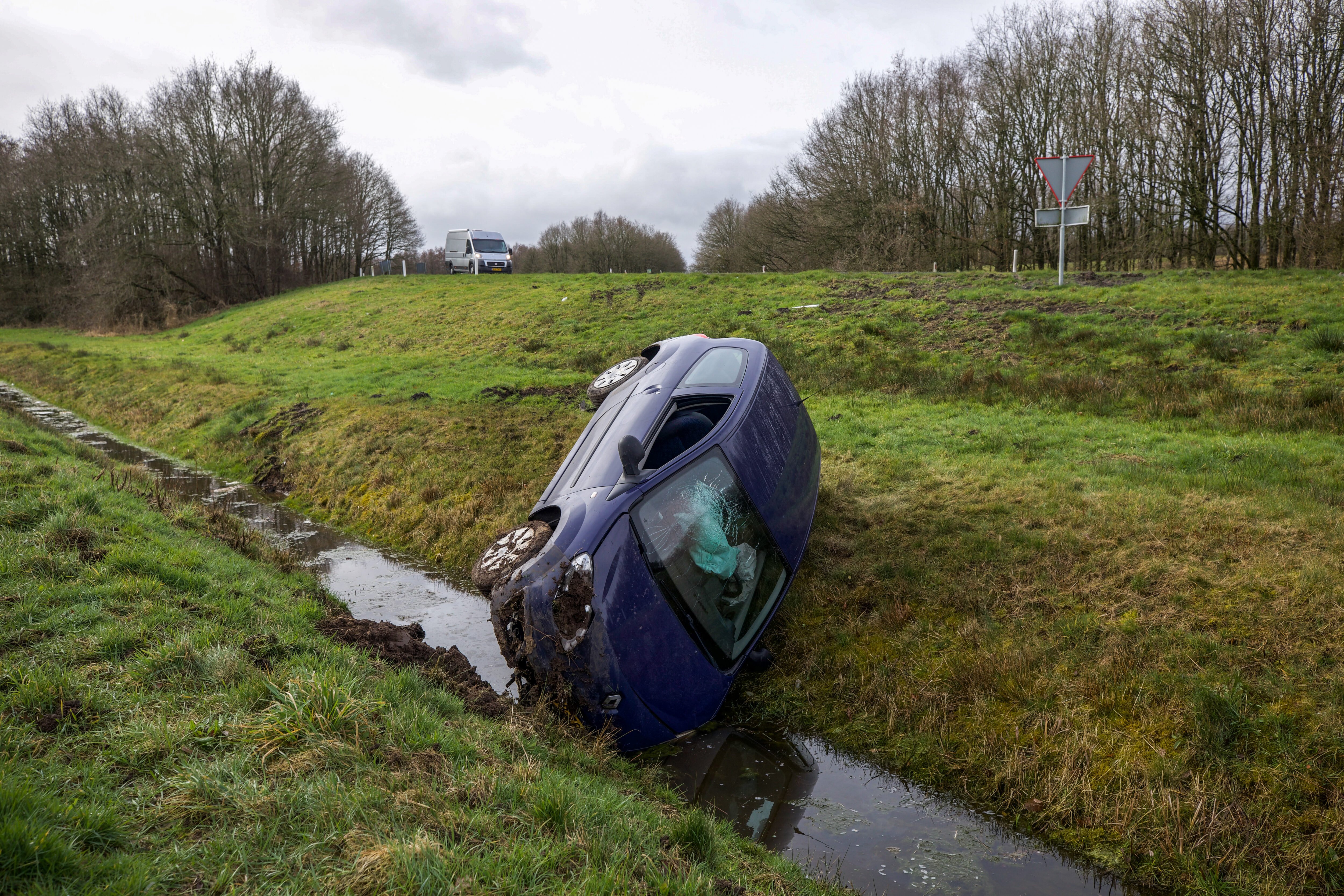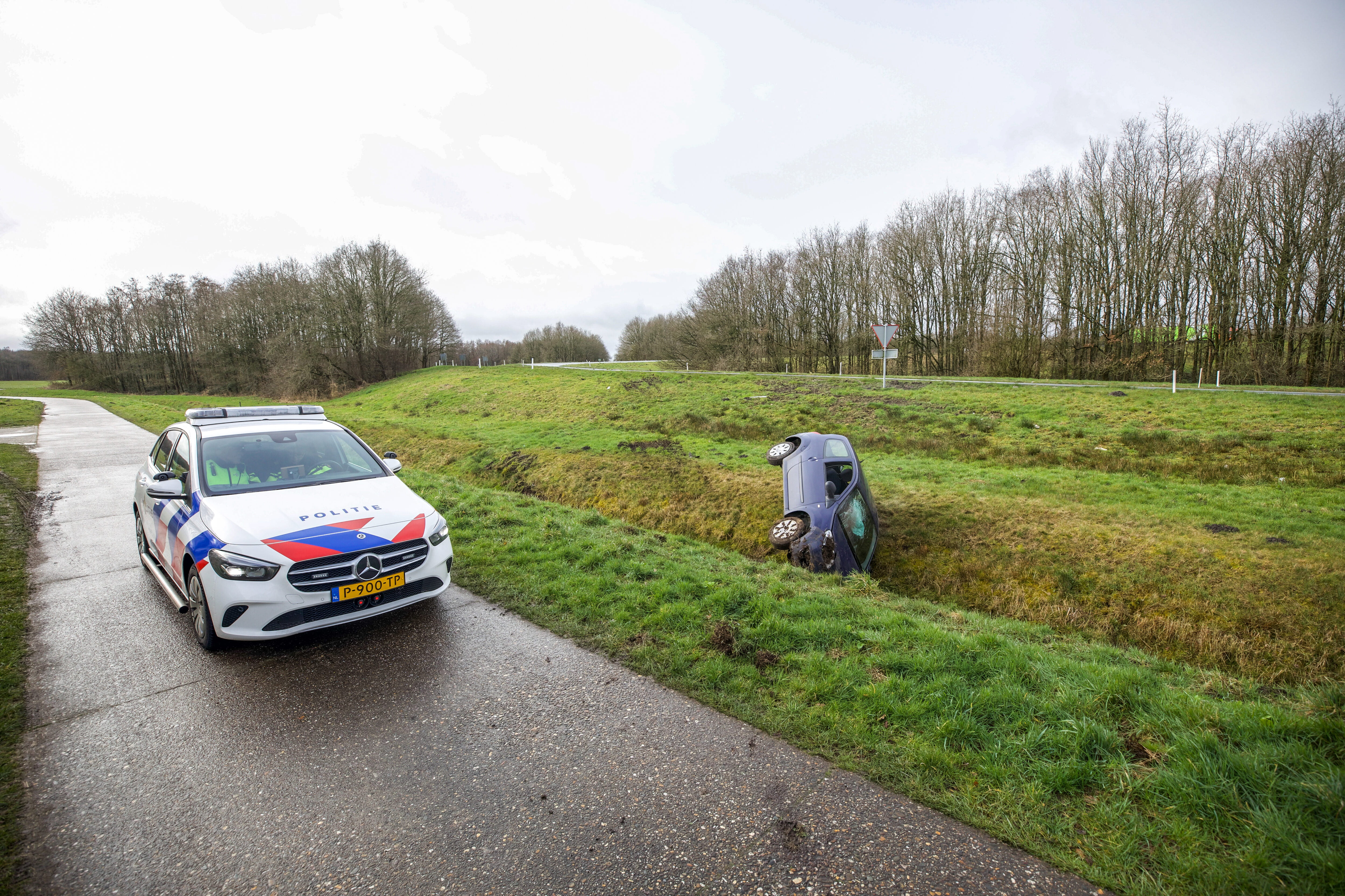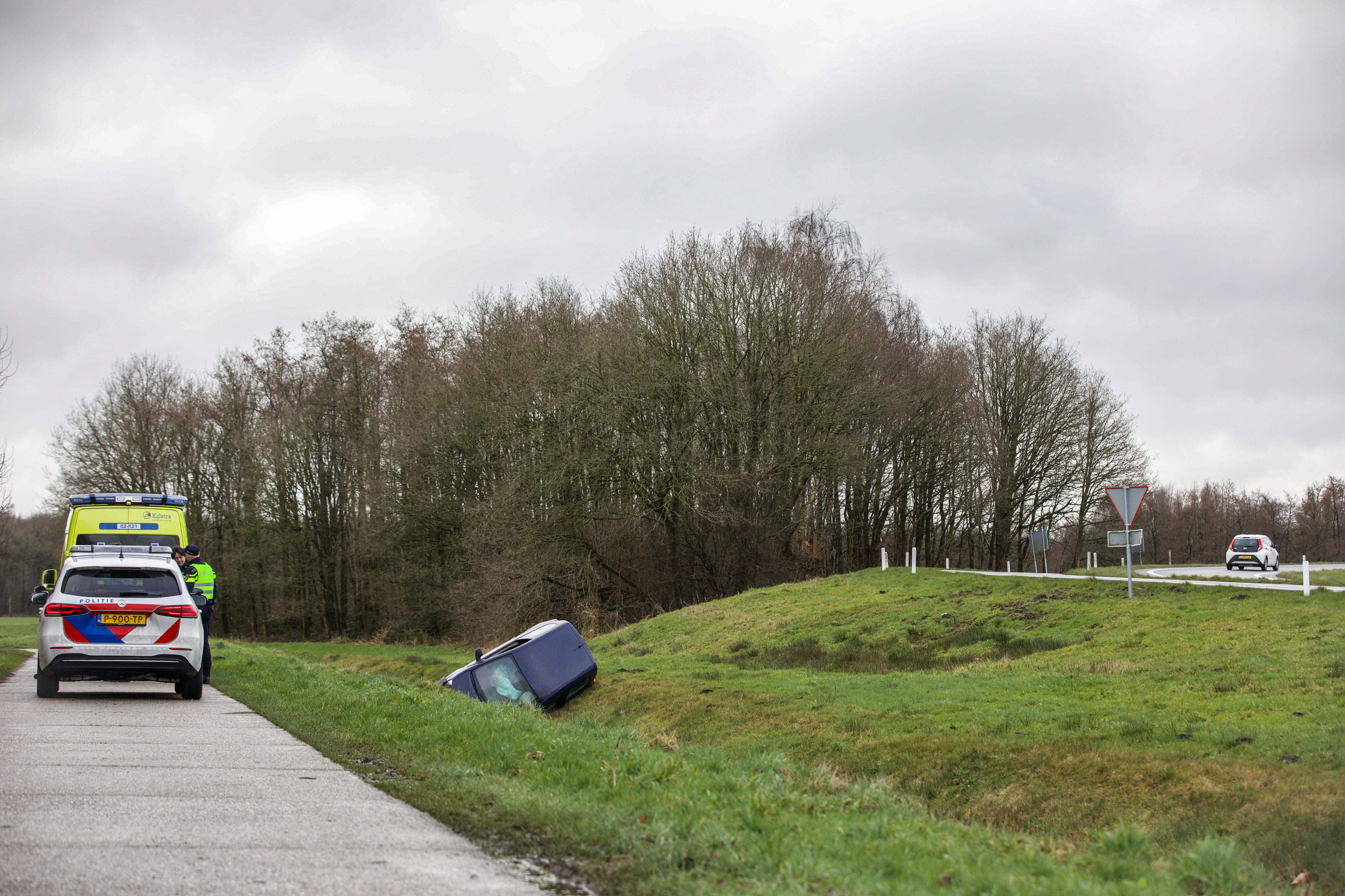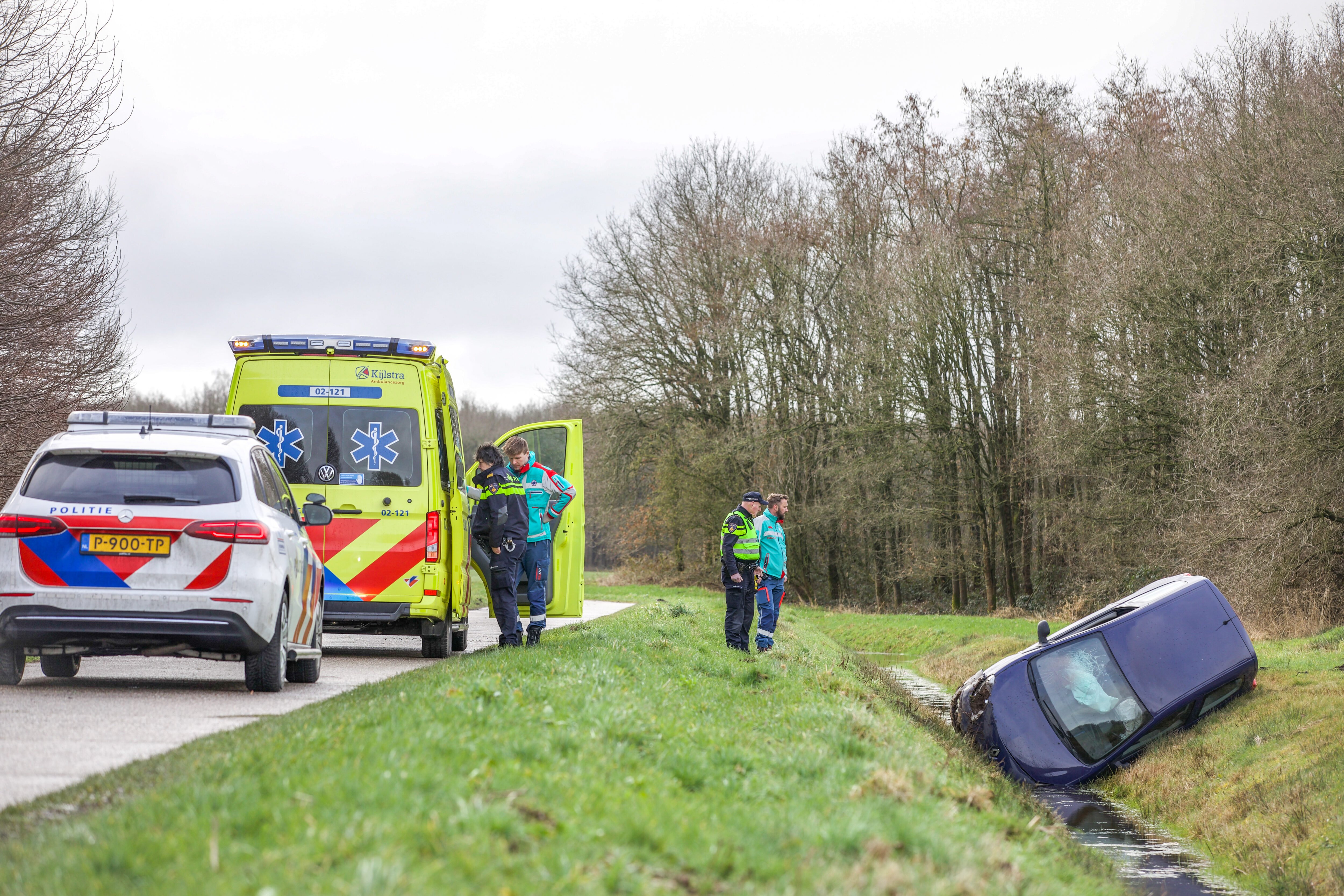Een ambulance en de politie zijn ter plaatse ter hulpverlening aan het slachtoffer. Deze kon zelfstandig uit de auto komen. De vrouw is in de ambulance gecontroleerd op verwondingen. De auto raakte flink beschadigd en is afgesleept.