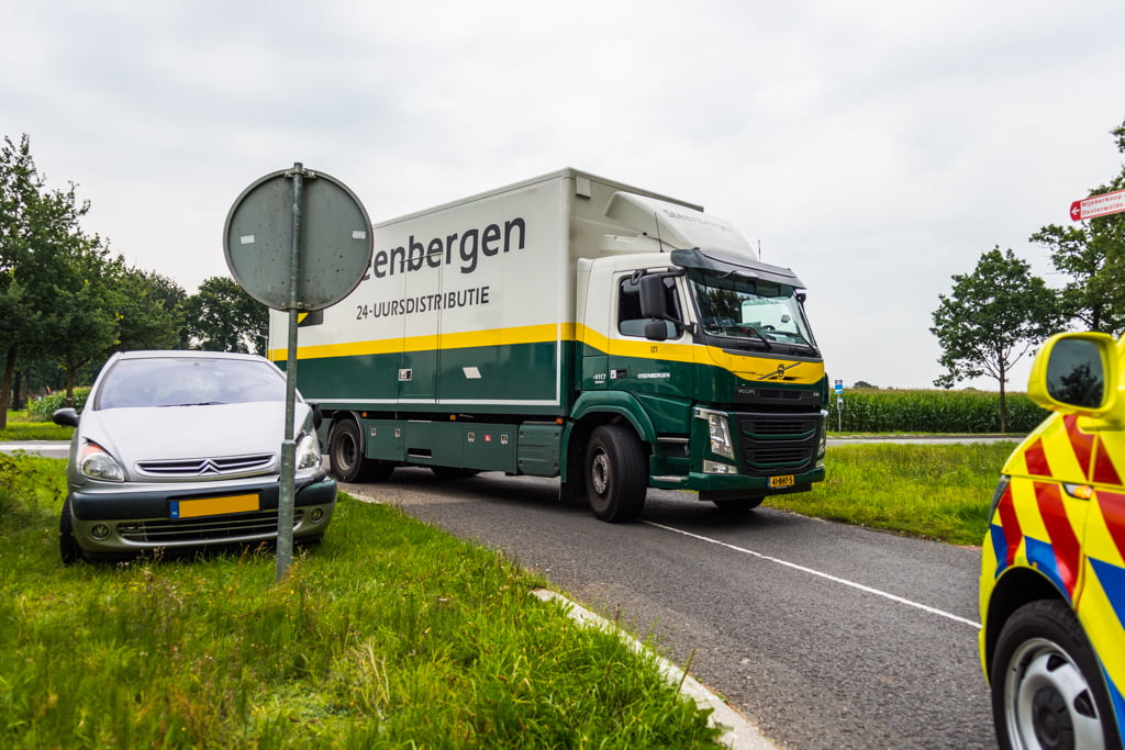 Oldeberkoop – Een vrachtwagen en personenauto kwamen dinsdagmiddag omstreeks 15:10 uur met elkaar in botsing op de rotonde met de Stellingenweg en de Noordwolderweg. De personenauto liep hierbij flinke schade op.