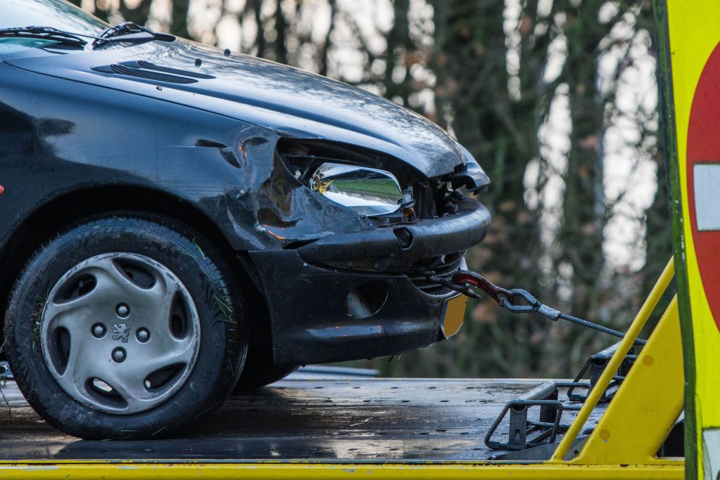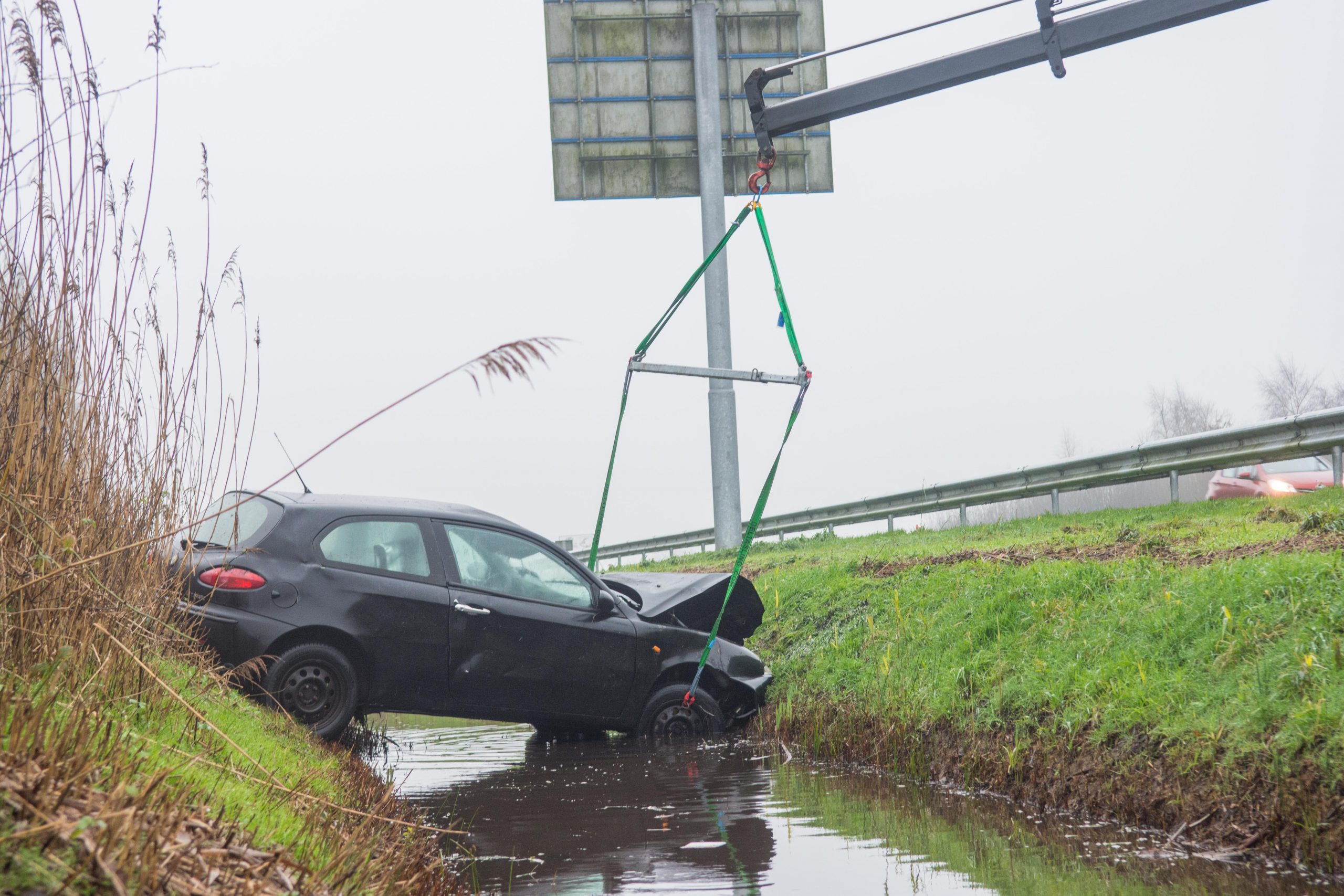 De auto stond in de berm naast de afrit geparkeerd, enkele vrachtwagens die langs de auto reden konden hem maar net passeren. Een berger heeft het voertuig afgesleept en naar een veilige locatie gebracht.