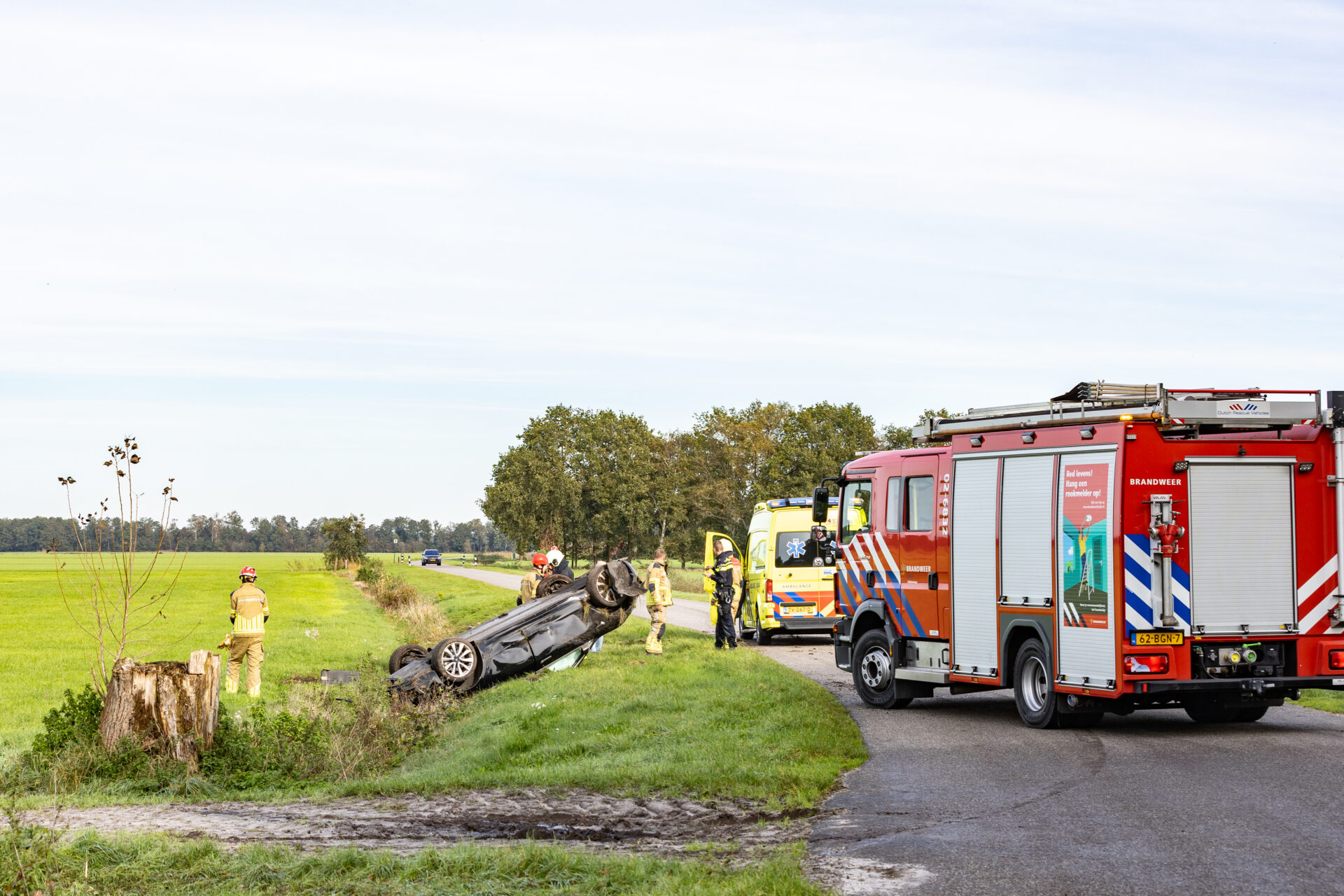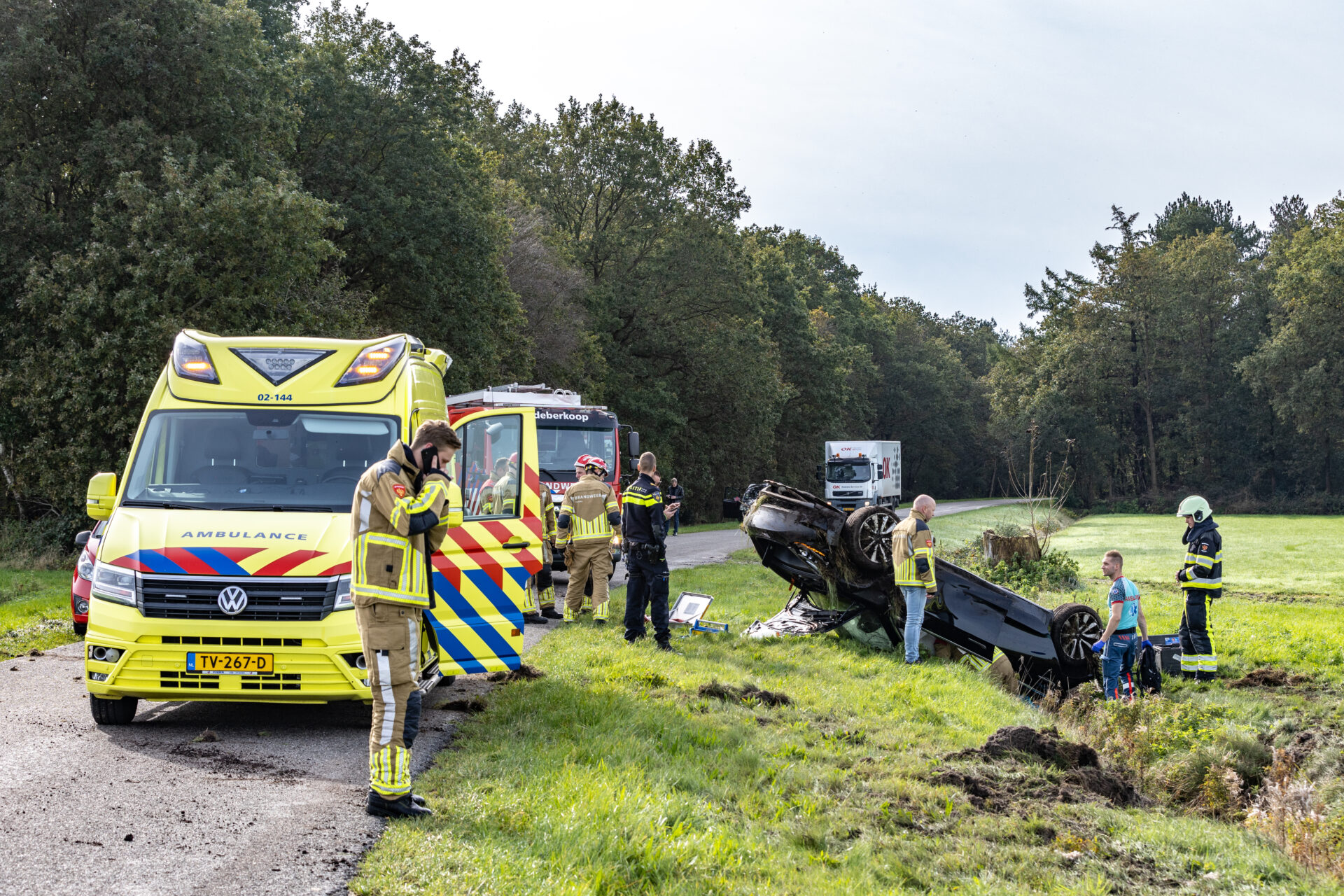 De weg was afgesloten voor verkeer. De brandweer van Oldeberkoop heeft de auto veiliggesteld en documenten uit de auto gehaald.