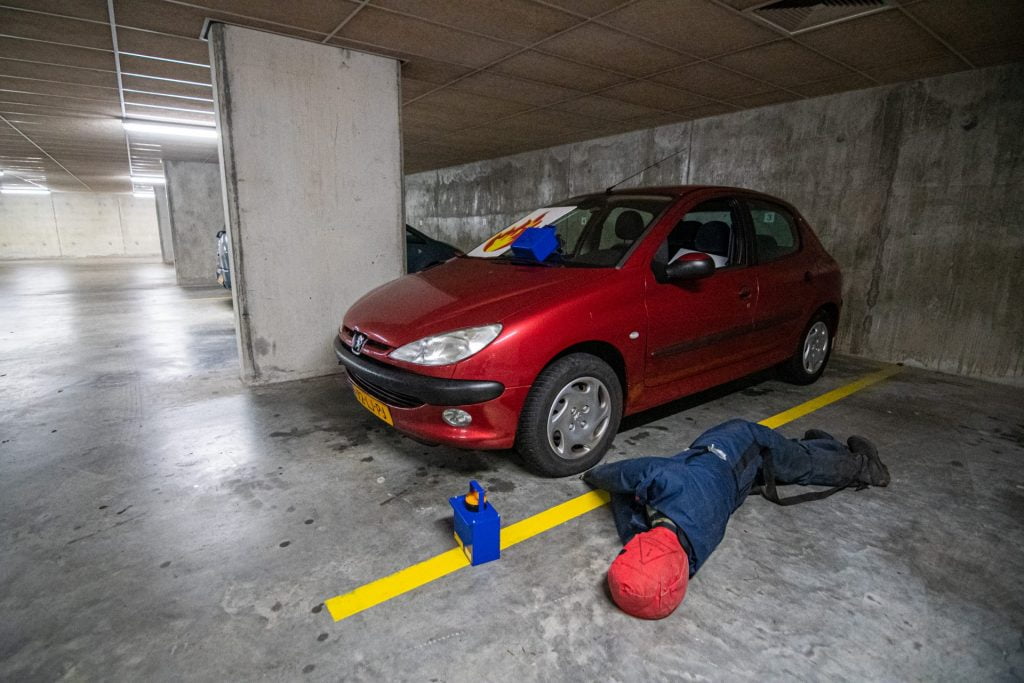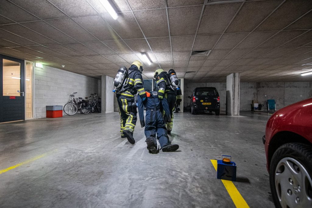 De ploeg werd opgewacht door een bewoner wiens dochter zich in de kelder zou bevinden. Met behulp van zijn sleutel zijn de brandweerlieden het complex in gegaan. Beneden in de kelder troffen zij de fictief brandende auto aan en hoorden zij meerdere mensen om hulp roepen.