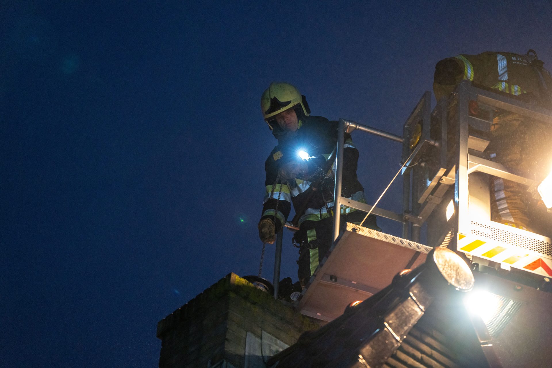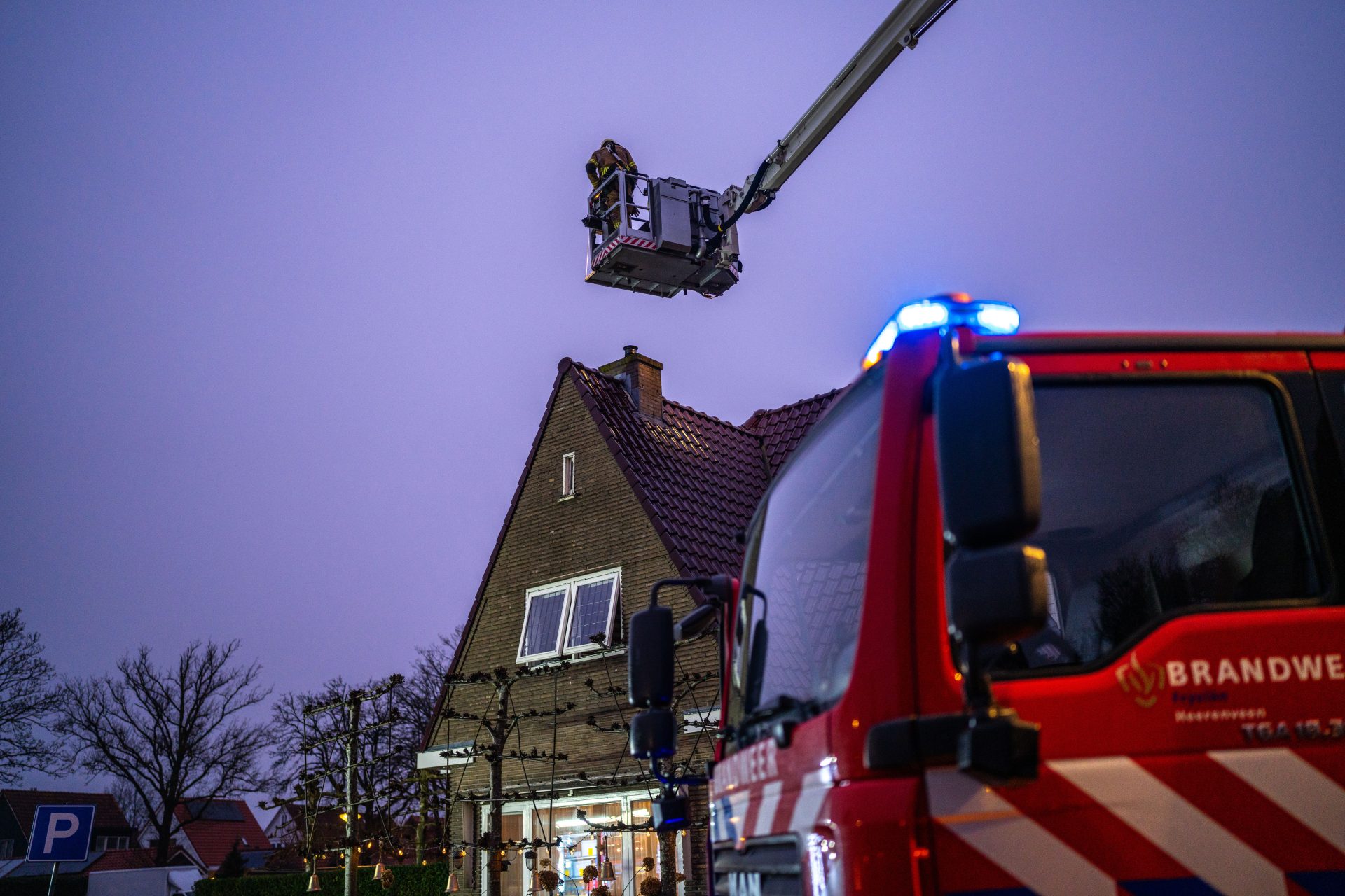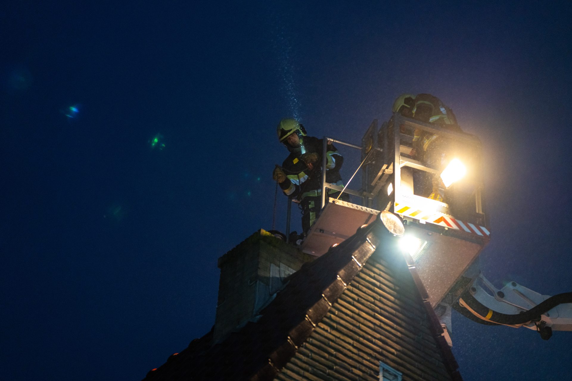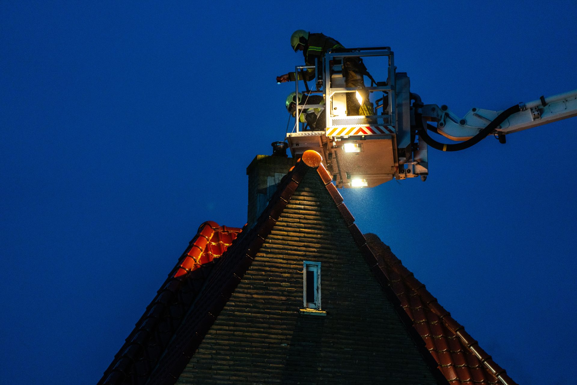 Hoe de brand kon ontstaan is nog onduidelijk. De hoogwerker is opgesteld om vanaf boven de schoorsteen te vegen.