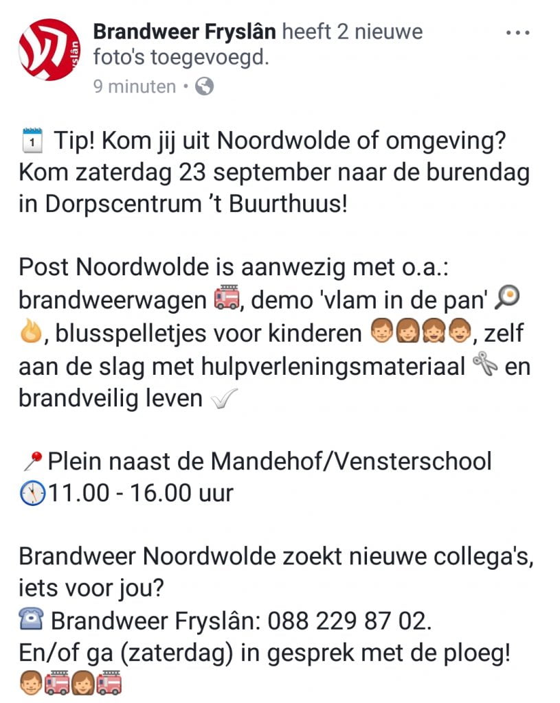 De brandweerlieden zijn aanwezig met een blusvoertuig en vertonen diverse demo’s. Zo laten ze zien waarom je een vlam in de pan niet met water moet blussen en kan jong en oud met het hydraulischgereedschap aan de slag.