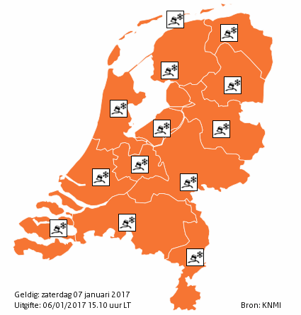 Regio – Meteorologisch centrum KNMI heeft voor zaterdag 7 januari code oranje afgegeven voor heel Nederland. Dit in verband met sneeuw en gladheid door ijzel.