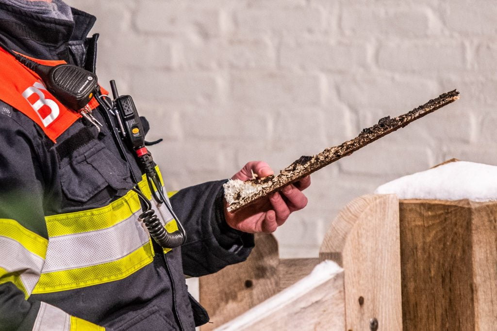 De bewoners merkten de kleine brand al snel op en schakelden de brandweer in. Nadat het vuur in de houtkachel gedoofd was, konden de brandweerlieden beginnen met de speurtocht naar de brandhaard. Die bleek uiteindelijk boven achter enige schotten te zitten.
