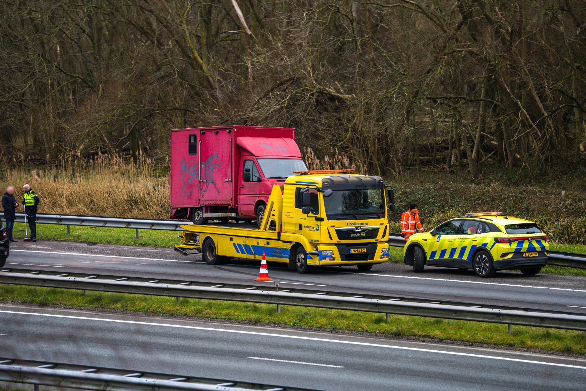 Rond 13:10 uur ging het mis en kantelde de bestelauto/paardenauto op de rijbaan. Het voertuig kwam dwars over de weg te liggen en blokkeerde daarmee de weg. Omstanders schoten te hulp en alarmeerden de hulpdiensten.