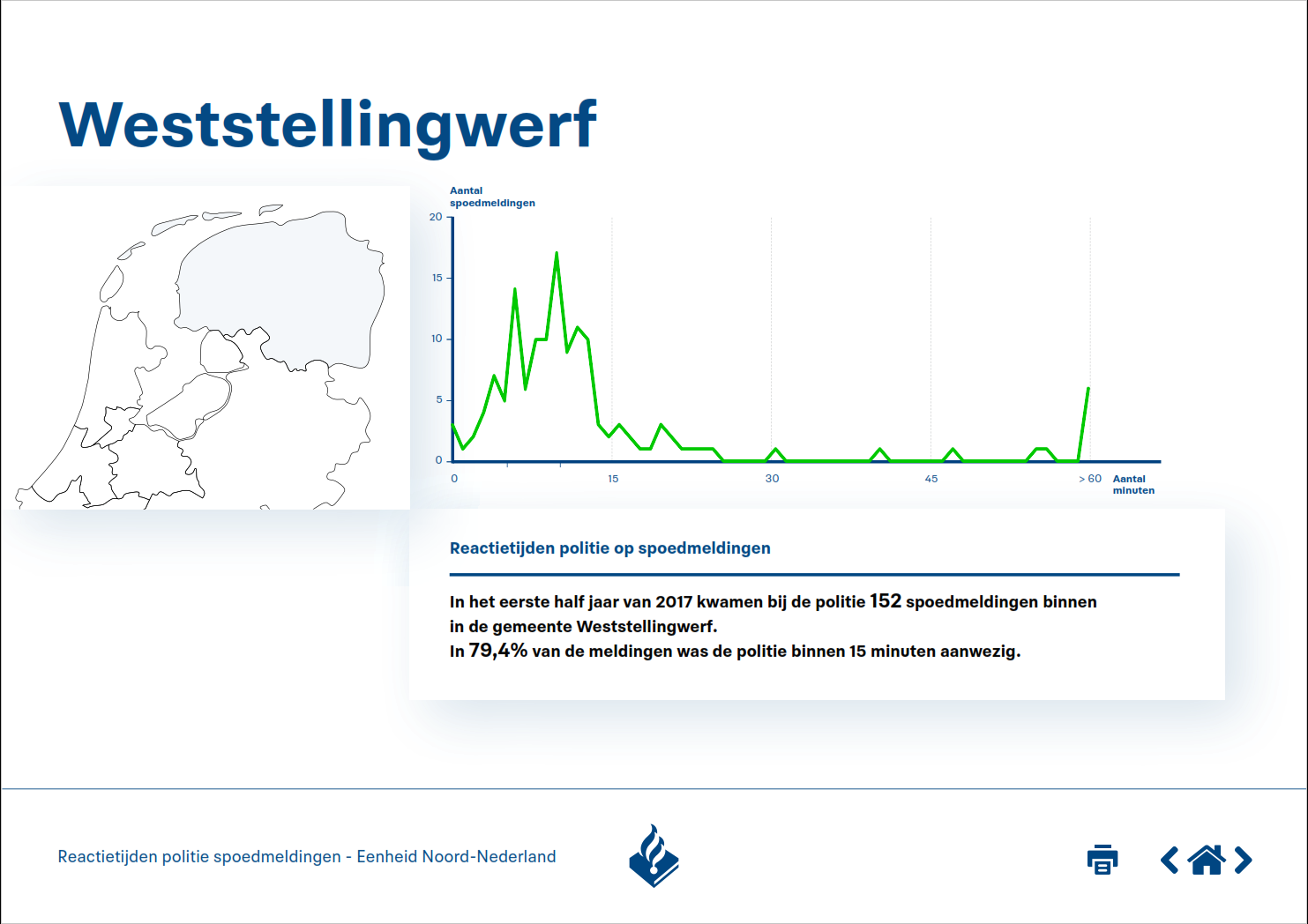In Heerenveen was de politie al sneller ter plaatse. In 85,4% van de 445 meldingen waren binnen 15 minuten agenten ter plaatse.
