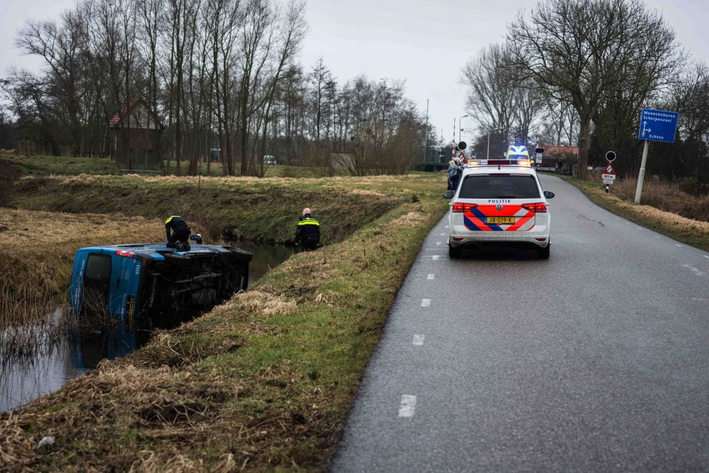 Munnekeburen – Langs de Grindweg in Munnekeburen is vrijdagmorgen een taxibusje in een sloot beland. Daarbij raakte de bestuurder van het voertuig bekneld in zijn voertuig.