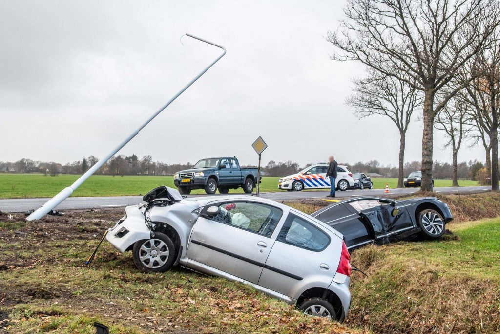 Twee auto’s in de sloot en lantaarnpaal beschadigd na ongeval