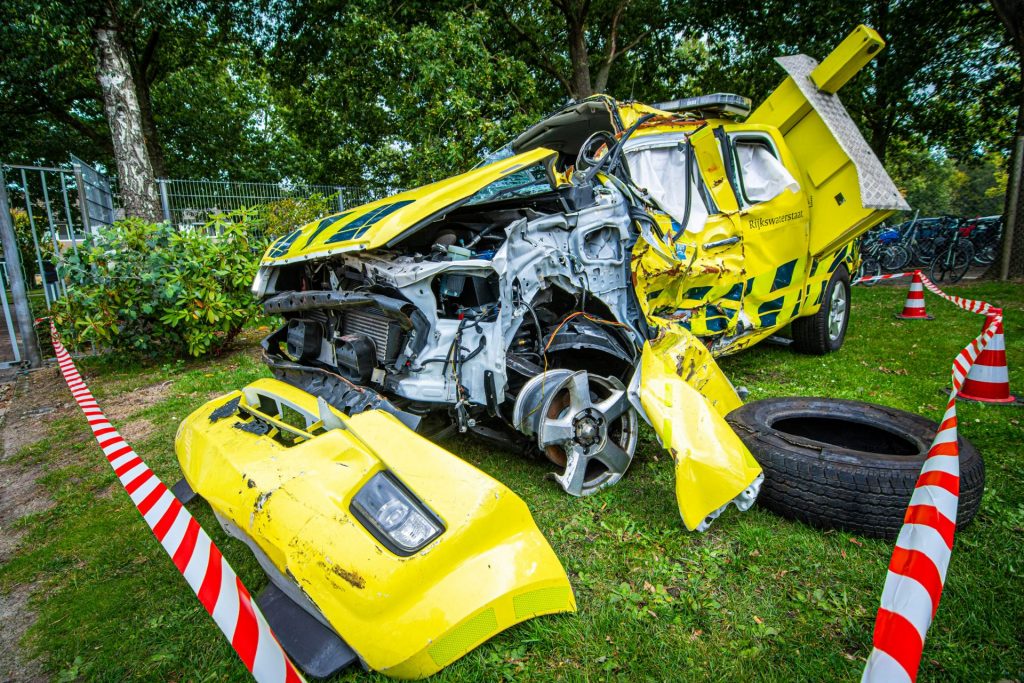 Enkele bezoekers stonden met grote ogen te kijken naar een compleet verwoestte pick-up van Rijkswaterstaat. Deze reist het land door als demomodel waarom het zo hard nodig is om op te letten op de snelweg.
