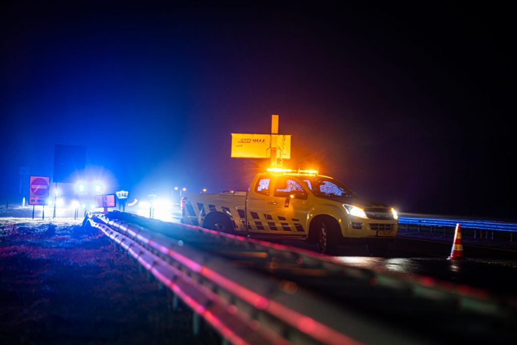 Een reinigingsbedrijf is ter plaatse gekomen om de snelweg leeg te maken van de lading grond die op het wegdek was beland.