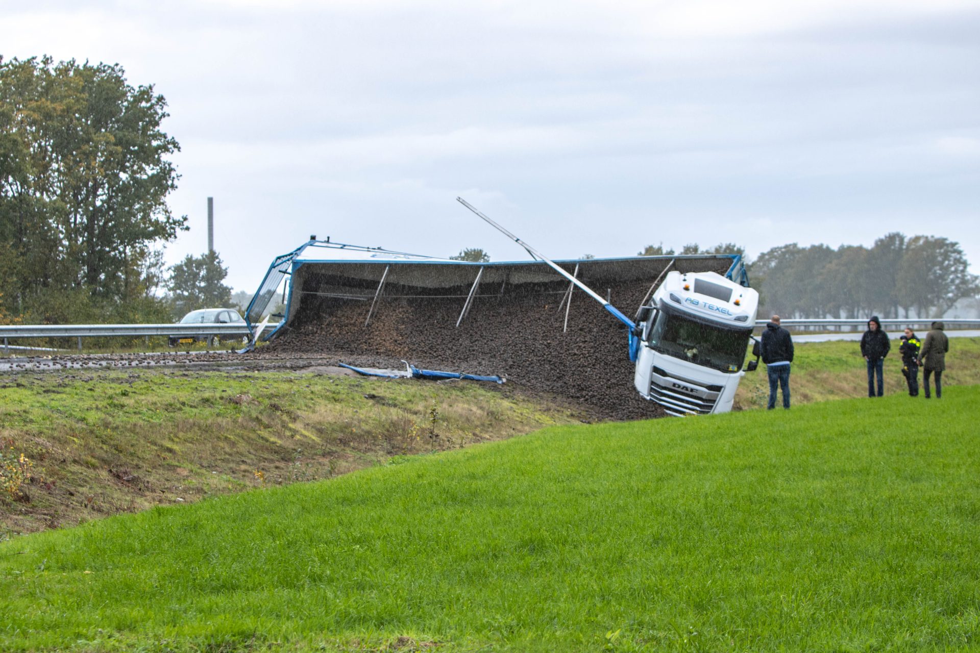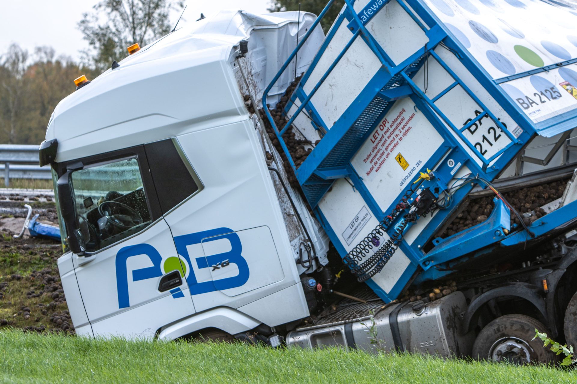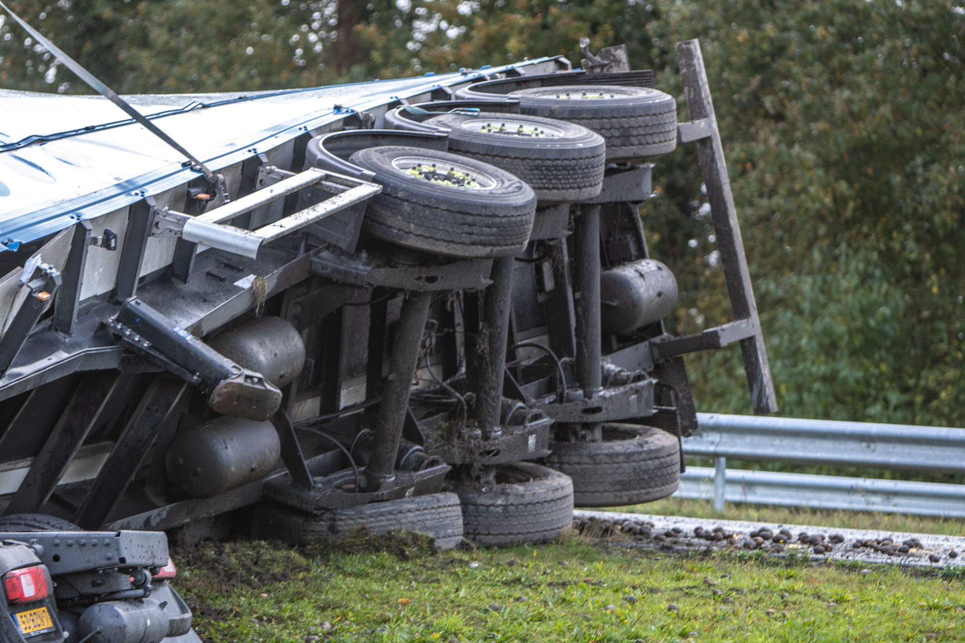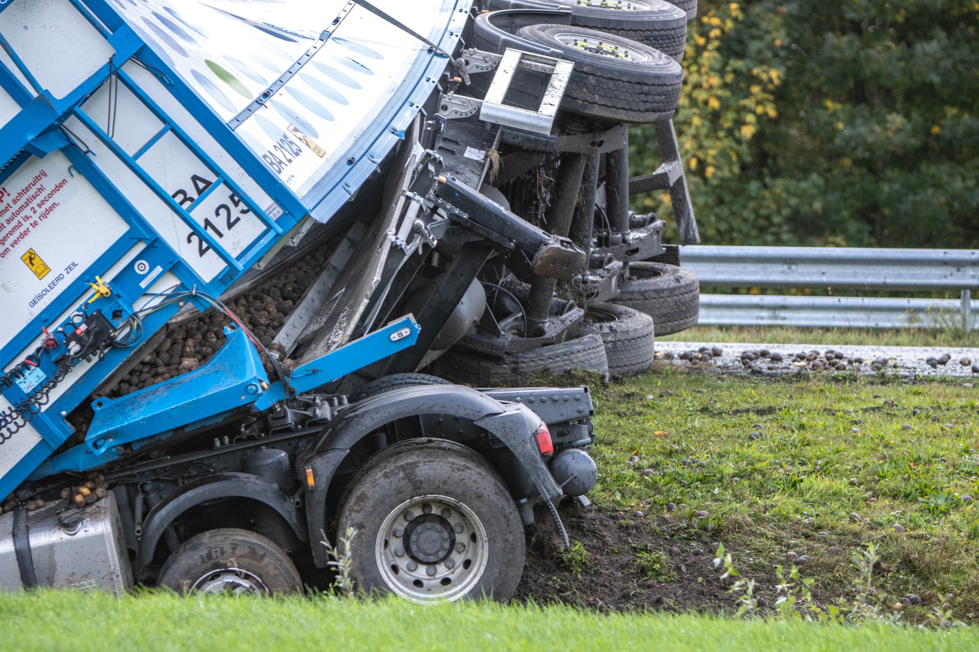 Rond 14:20 uur ging het mis toen de vrachtwagen in de berm terecht kwam. De chauffeur verloor hierdoor de macht over het stuur, waarna de combinatie schaarde en de trailer kantelde. De lading, een vracht aardappelen, is hierbij de trailer uitgerold.