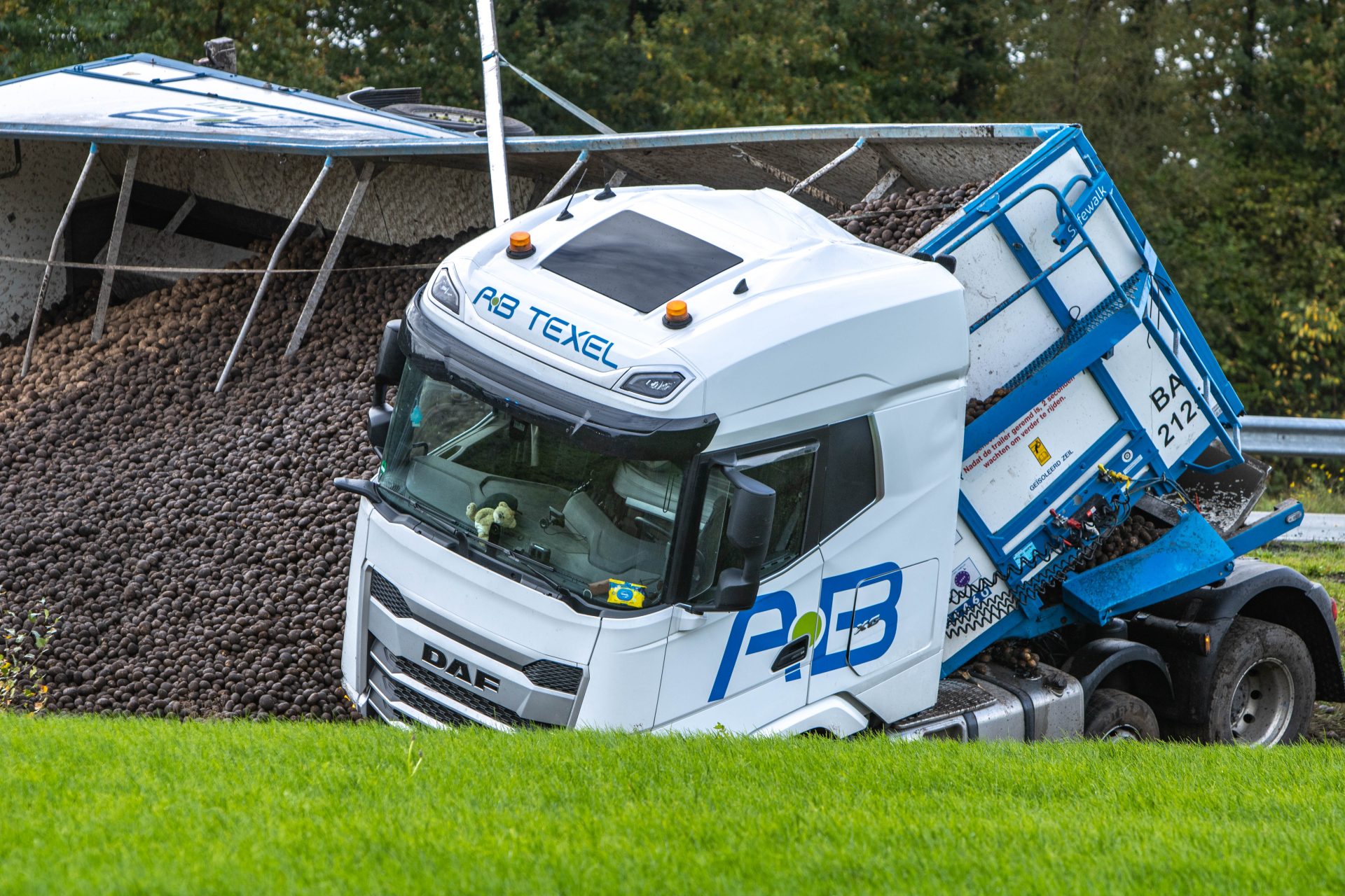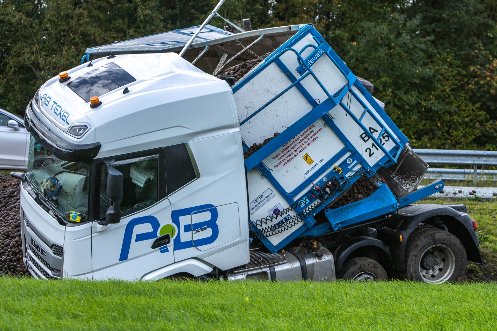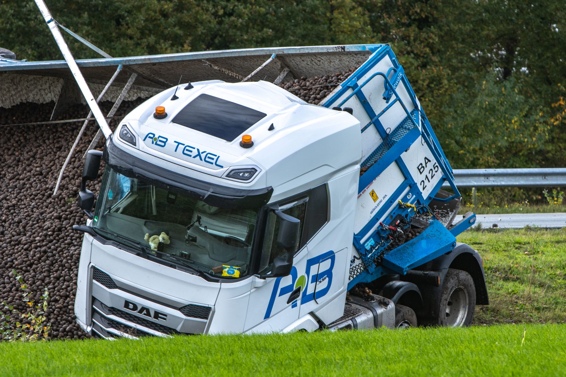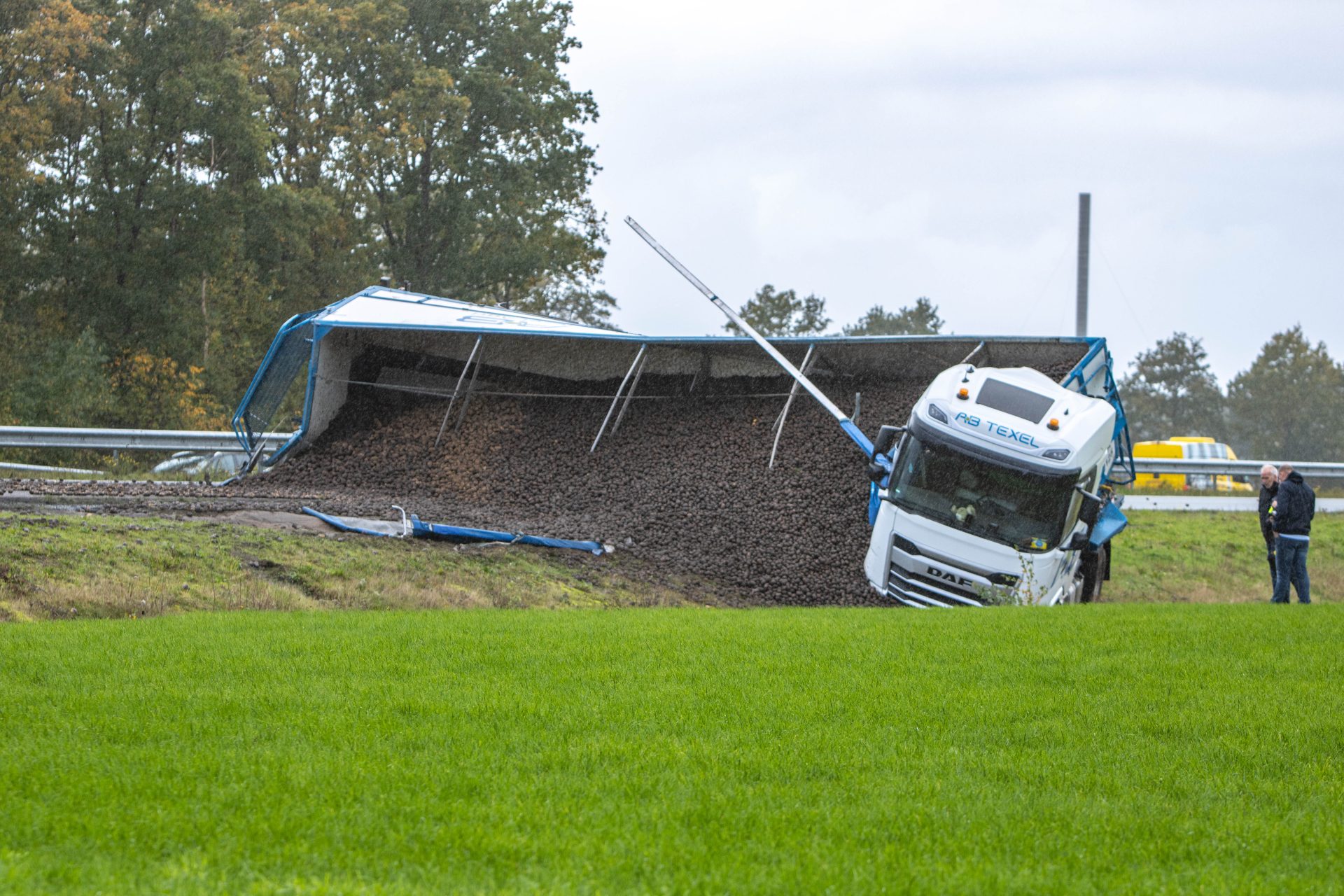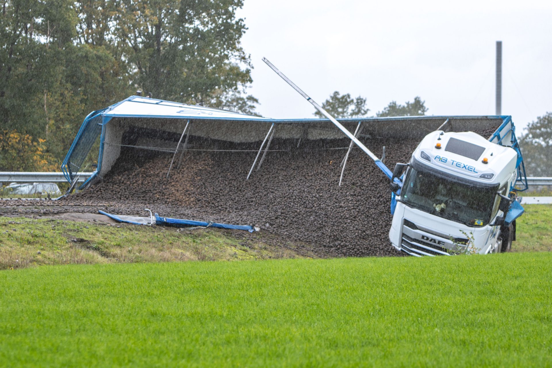 Rond 14:20 uur ging het mis toen de vrachtwagen in de berm terecht kwam. De chauffeur verloor hierdoor de macht over het stuur, waarna de combinatie schaarde en de trailer kantelde. De lading, een vracht aardappelen, is hierbij de trailer uitgerold.